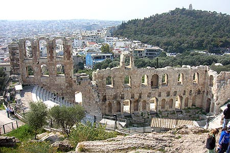 Along the south slope of the Acropolis are two ancient theaters, the Theater of Dionysus and the partially rebuilt Odeon of Herodes Atticus seen here. The Odeon actually dates to Roman times and is still used for events today.
