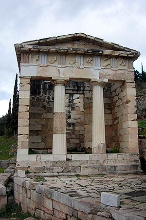 The partially restored Athenian Treasury, seen here, is perhaps the most impressive of the treasury house ruins.