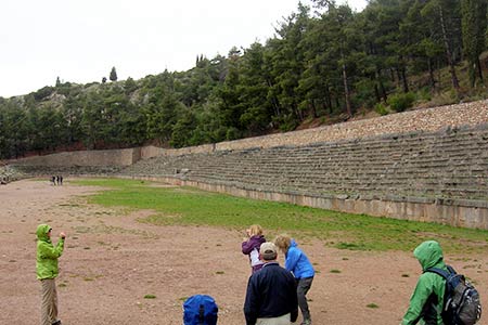 Further uphill from the theater is the Stadium, site of the quadrennial Pythian Games. It was originally built by the Greeks, but renovated substantially in the 2d century by the Romans. The track is almost 200 yards long and is flanked by limestone grandstands with sufficient seating for about 7,000. Now let's leave the Delphi archeological site and walk to the nearby museum.