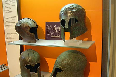 Among the offerings presented as gifts at the Temple of Apollo were military items, such as these Corinthian helmets dating to the 7th - 6th centuries BCE.