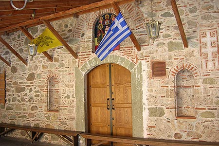 The attractions are spread over three levels. The top level has the old kitchen, the refectory (complete with silverware and plates on the table, and icons on the wall), and the church. Like some of the other monasteries, the church has impressive floor-to-ceiling Byzantine frescos. The middle level has a series of little museums including one with a bunch of old manuscripts, one with religious articles, and the best of the three, a little historical museum covering from 1820 on. The historical museum, set in a room with the smell of incense and the sound of ecclesiastical music in the background, has lots of uniforms and weapons from various Greek struggles as well as patriotic posters from the wars of the 20th century.