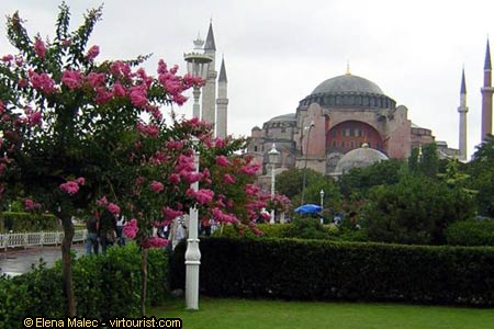 Other Roman columns in Sultanahmet Square are: Constantine's Column, brought from the Temple of Apollo in Rome, was originally a statue of Apollo, which was replaced by Constantine the Great with his own statue dating from 330 AD; and the Serpentine Column, found in the Temple of Apollo in Delphi and brought to Constantinople also by Emperor Constantine the Great. In the picture is Hagia Sophia as seen from Sultanahmet Square.