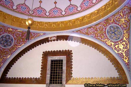 Before making a choice let's enter the Divan Hall. The Divan Odasi or Chamber of State is where the Council in Ottoman times met four days of the week under the Grand Vizier. In this photo you can notice a window with an iron grill, which was used by the sultan to discretely observe the meetings. The room is beautifully decorated with gold and Iznik tiles.