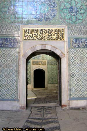 We can now return to the Second Court and buy tickets for admission into the once most secret quarters of the palace: the harem. The Topkapi Palace Harem buildings were added in the late 16th c. during the reign of Sultan Murad III. With a total of 400 rooms the harem visit would take days, so it is limited to just a few apartments through which you are guided in groups, for about half an hour. From the Courtyard of the Black Eunuchs (photographed here) you see a succession of courtyards decorated with splendid tiles and calligraphy.