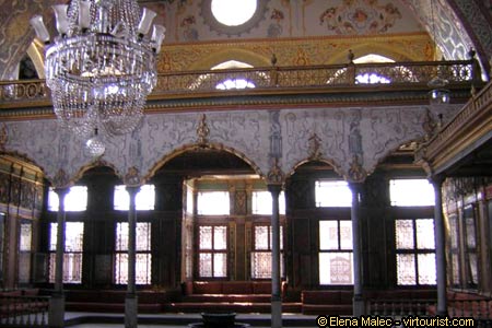 This is a photo of the Imperial Hall; built in the late 16th c. it still has some of the original decorations. At the right there is the Imperial sofa from where the sultan used to watch private receptions and entertainment. As the history of the Seraglio harem was always topic for romance and fantasy, not to mention the theme of many works of art pictorial and literary, and musical compositions, the reality of daily life in the royal harem was far from legend; it had the routine, rigors and rhythms of palace life anywhere else except for the inaccessibility which the name Harem implies (Arabic: not allowed, forbidden). Thus we leave the Place of Felicity, as the Ottoman Harem was known, and return to the Imperial Gate for a detour on the way to the Archeological Museum.