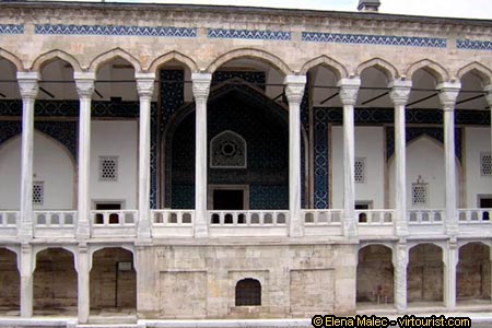 Cinili Kiosk, an enduring building from the reign of Mehmet the Conqueror, XV c, was restored in the 1950s and opened as a ceramic museum. In this photo you can see the marble portico of the entrance to the museum, that consists of 14 columns and splendid enamel mosaics, hosting today the famous Iznik tile collections (Iznik is the former town of Nicaea; "cini' is the name given to handmade glazed tiles, the traditional ceramic technique brought by the Seljuks to Anatolia, that made its fame since the 14th c.) Towards the end of the 19th c. and the beginning of the 20th c. new buildings were added to the museum as the collection grew to an approximate 2,5 million pieces of works of art, out of which only one tenth is on display.