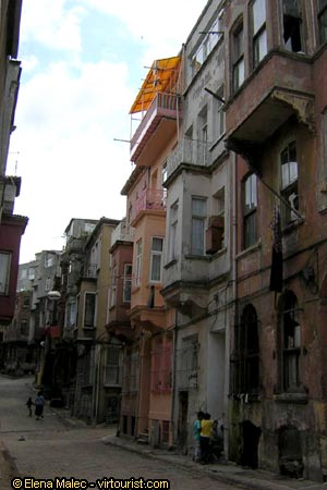 As we continue our walk amid homes and shops almost in ruin we enter the once wealthy neighborhood of Fener or Phanar, home to the predominantly Greek community of Istanbul. This used to be the quarter of the Greek aristocrats, clergy, merchants of old days Ottoman Istanbul - the Phanariots. Mostly of Greek descent the Phanariots were well educated Christians, fluent in foreign languages, who were allowed to trade, manage the finances of the Empire and hold high positions in the Ottoman administration. Through their influence and power they amassed great fortunes living in sumptuous dwellings in Phanar overlooking the Golden Horn; where a distinctive architectural style was developed in the 17th and 18th c, which was soon exported to other places in the Balkans. In this photo you can see a street in Fener with typical Phanariot mansions (the bay window and balconies).