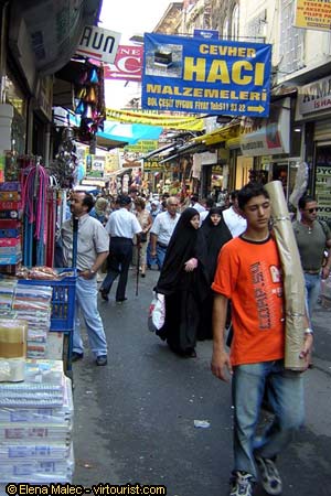 The shopping area of the bazaar spreads over more than 60 streets, crowded with small shops usually of household appliances, textiles, shoes, clothes, curtains, stationery, knick-knacks, haberdashery, food items. In the photo a hamal - person carrying goods for somebody, two Christian Orthodox nuns dressed in black, shop signs and outdoors merchandise on a busy street in the Bazaar.