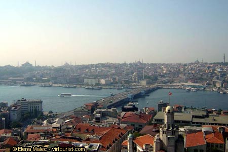 In my photo you can see the Galata Bridge, Eminonu docks and square, and the mosques and landmarks of the old city: from left to right, Hagia Sophia, the Blue Mosque, Suleymaniye Mosque, Yeni Mosque .