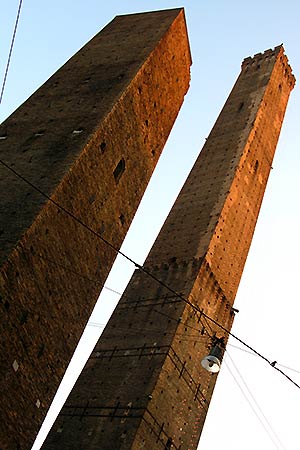On the right you have the Torre degli Asinelly, with 98 meters (320 ft), one of the Two Towers. It is open to the public, from the top there is a spectacular view of the city. Its companion is the Gariselda Torre, 48 meters (157 ft). Both towers are at the end of Via Rizzoli, in the center of the old town.