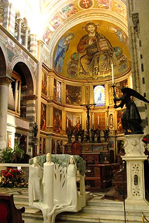 In this picture you can see the interior of the Dumo. Most of the works in display are from Pisa leading renaissance artists. The previous works were destroyed in a fire in 1595. Some of the masterpieces of the cathedral are the Pisano Pulpit, a work by Giovanni Pisano, the tomb of Emperor Henry VII and the mosaic of Christ Pantocrator.