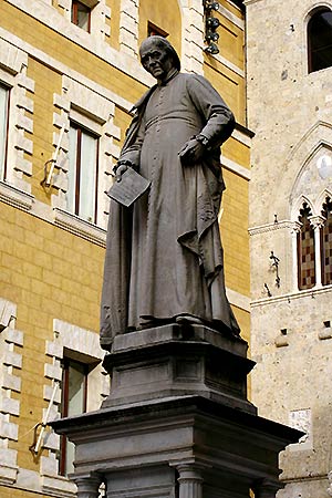 If you take the local bus from the train station to the medieval town, you will be dropped outside the city walls. Enter the old town, and a pleasant walk along Via Montanini will take you to Piazza Salimbeni, where the Palazzo Salimbeni sits. The Palazzo houses the Monte dei Paschi di Siena, one of the oldest banks in the world. In the picture you can see a statue in front of the Palazzo Salimbeni.