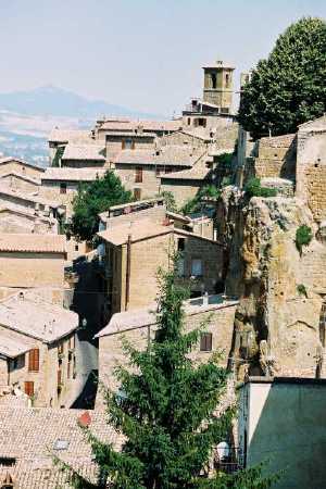 Orvieto is a fortified city built on a rocky volcanic promontory. It is surrounded by ramparts, through which a few gates give access to the city centre. Its houses and palaces are built on, against, or sometimes even in the volcanic rock. Mountaintop villages, towns and cities are not rare in the region : the Etruscans, who were the first to settle in many of the sites (some as early as 8 centuries B.C.), favoured hilltops for both strategic and climatic reasons; but as on these hilltops water was hard to come by, they had to dig cisterns and wells, more about which later.
