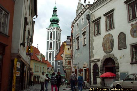 In the Rozmberk towns the district below the castle was traditionally called Latran. In this district used to live the servants and artisans that worked in the castle. Thats where we are right now. This is one of the most beautiful areas in Krumlov. The tower you can see in front of us is part of the St. Jodocus Church. This church was built in the 14th century, reconstructed in the 16th century. The church was first a catholic temple, then a Protestant one, a Catholic temple again and in 1788 it was sold to a wealthy citizen.