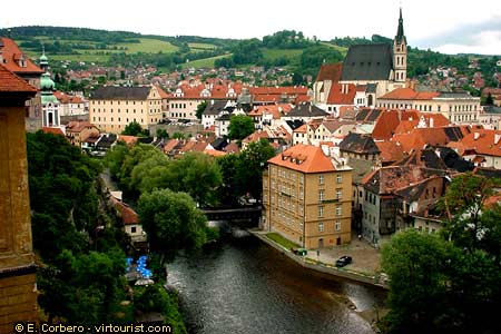 Here you can see part of the St. Jodocus Churchs tower on the left, the Lazebnicky Brige over the river Vltava and the Church of St. Vitius at your right. The Church of St. Vitius is the second most important building in Cesky Krumlov. The church was constructed in the 15th century over an early 14th century church. Inside the church there are some interesting 17th and 18th century altars, some restored frescoes and, in a niche, lie the hearts of some members of the Schwarzenberg family.
