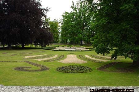Here you can see part of the middle part of the garden. The garden, with evident Viennese influences, was founded at the end of the 17th century by J. Kristian of Eggenberg. The garden has underwent several changes through the centuries. The original garden was designed over a 11 hectares land, by J. Maggi and P. Spinetta. In 1749 J. A. Zinner became the official gardener, he designed the different levels with its different ornamental objects. The most dominant of which is the Cascade fountain (at our back), lets take it a look ...