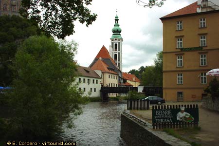 Here you can see the river Vltava, the Lazebnicky Most (=bridge) and the Byvalky Kostel S. Josta (= Former church of St. Jodocus and hospice). We saw the tower of this church before, remember? Next to this church theres the former estate hospice (1317), where shelter and care was available for the Cesky Krumolv estate older workers. Since 1922 its not a hospice anymore, currently there are only flats and a pub built over the old hospice rests.
