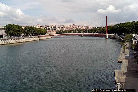 Two big rivers converge in Lyon. The smallest one is the Saone River -- the one in the photo. The biggest one is the Rhone. To the west of the Saone river -- on the left -- sits 'Vieux Lyon' and the Fourviere Hill. Between the two rivers -- on the right -- is the 'centre ville', with the old Terraux neighborhood, Place Bellecour and the Perrache train station. To the east of the Rhone sits Part Dieu District and most of the city's neighborhoods.