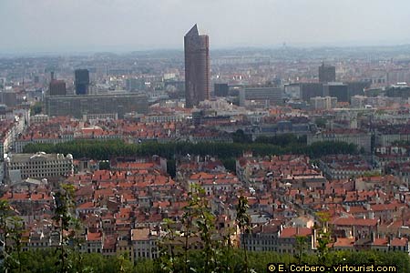 Here you see a view of the city from the 'Esplanade Fourviere'. The roofs you see at the bottom of the picture are of some of the houses in the town center ('Centre Ville'), between the two rivers. You cannot see the rivers from here, but you can see the trees that surround both river's banks. The trees at the bottom surround the Saone banks. The green line in the middle of the photo are the trees that surround the Rhone banks. Above this line of trees is the 'Part Dieu' district and its main landmark: the 'Credit Lyonnais' Tower.