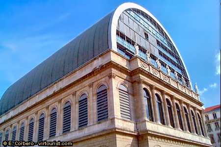 In this photo you can see the beautiful building of the National Opera House of Lyon. This strange building is the result of the recent restoration works. The four facades were respected, but nothing else. Eleven new levels were added, five underground and six under the new glass dome. 1,200 spectators can enjoy the excellent acoustic of its main hall, while state of the art computer programs control the light effects.