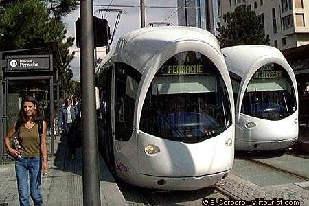 In this photo you can see a couple of beautiful tramways. These ultra modern tramways are really comfortable! Public transportation in Lyon is excellent. Lyon has an underground network -- 'the metro', that operates from 5 am to midnight--, several tramways lines, two funiculars and a reliable bus network --from 5 am to 9 pm. You can buy a single ticket -valid for one hour- or a one day ticket. I recommend the one day ticket, for the price of three single tickets you can travel 24 hours. A great deal!