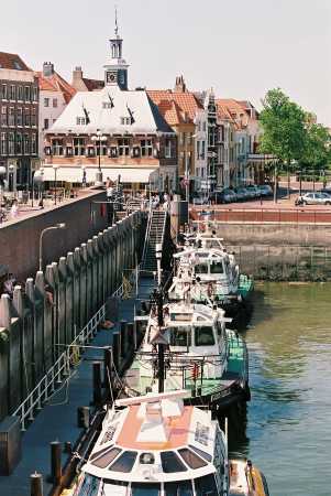 Vlissingen (in English, “Flushing”) is a harbour town overlooking the estuary of the Scheldt, a large river which leads to the Port of Antwerp in Belgium. It is not surprising, then, that pilotage (guiding large ships into the proper lanes regardless of the weather) is one of the town’s key activities. The picture also shows some typical Dutch architecture, with small gabled houses and white, open steeples.