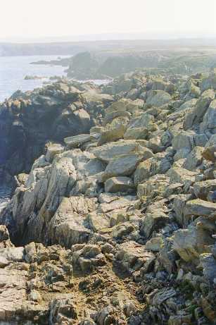 This picture shows the north coast of Ouessant on a quiet day. The coast is jagged and rocky, and exposed to the northern gales. As a consequence, there is very little vegetation, and the coast takes on this desolate, chaotic look.
