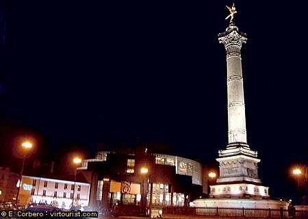 In the photo you can see the 'Colonne de Juillet' (July Column) -which commemorates the overthrow of Charles X in July 1830- and the 'Opéra de la Bastille' -erected in 1989 to commemorate the bicentennial of the French Revolution. Since then this area has become quite trendy; with chic art galleries, jazz clubs, theaters, restaurants and bars.