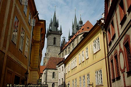 You can see here the Kostel P. Marie pred Tynem from behind. The construction of the Tyn Church began in the middle of the 14th century and was finished in 1511. This was the main church of the Hussite Prague. In 1621 the church was reverted to the Catholic Church again. The entrance to the temple is in the arcades of the old Latin School, where tickets for concerts can be bought.