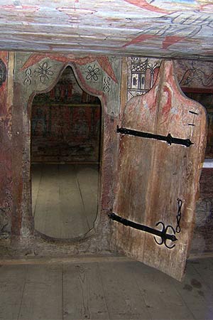 Located in the land of Lapus, in the Lapus River valley the wooden church of the Holy Archangels in Rogoz was built in 1663 by the villagers on the site of a former church. In 1834 a platform with a painted parapet was added to the west side of the nave. The same year the ceiling of the narthex and the vault of the nave were repainted while the windows of the nave were modified. The church displays a unique type of plan characterized by a polygonal narthex, a rectangular nave and an altar with a recessed heptagonal apse. On the inside the main beam of the vault above the nave and the supporting corbels are decorated with a twisted rope motif.