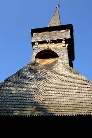 The Wooden Church of Pious Paraskeva, another monument on the Unesco World Heritage List is located in the historical area of Maramures in the Mara River valley. The church dates from 1770 and has preserved much of its original aspect except for the "windows" between the nave and the narthex which were added at a later date. The church is made of wooden beams arranged according to the Blockbau system. The church plan is traditional composed of a nave and narthex in the shape of a rectangle and a sanctuary with a polygonal recessed apse. The roof plays an extremely important role in defining the church impressive silhouette. It has double eaves over the narthex and the nave and a bell tower above the narthex with an open gallery with arcades and a tall pyramid-shaped roof.