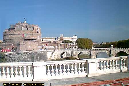 On the left you see the 'Castel Sant'Angelo', constructed to hold the grave of the emperor Adrian. It is supposed to be one of Rome's landmarks, but from here it's not such an impressive building. The Castle has a long and interesting history, though. It was a fortress, and during the Renaissance, a jail. Nowadays you will find a huge collection of military objects, and several rooms decorated with frieze --many of them works of Perin del Vaga--, and several Renaissances canvases and furniture.