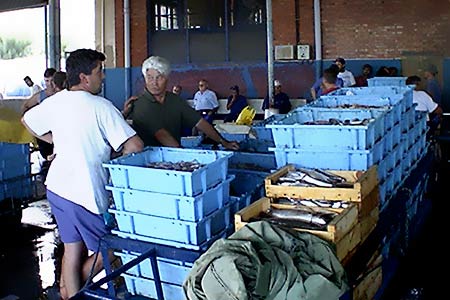Here you can see a couple of fishermen with their captures. In front of the boats there is a market where fish is sold a few minutes after their arrival. These fishermen are waiting for their turn to auction their catch. Unfortunately visitors are not allowed inside the market (entrance is only allowed to professionals). But we can see how the fish boxes get in the market ...