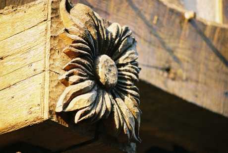 The supporting beams which protrude into the street and support the upper floors are decorated with carvings and sculptures.