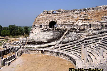 Famed for its commercial and maritime power, its scholars and philosophers, Miletus was the oldest of the Ionian cities. It had more than ten colonies in the Marmara and Black Sea, and its trade extended as far as Egypt. Miletus is also renowned as the first city to which the principles of modern town-planning were applied. The gridplan introduced by Hippodamos was later to form the basis of town-planning in all Roman cities. As a learning center Miletus was made famous by names like Thales, Anaximenes and Anaximander, and provided the classical world with an alphabet widely accepted. Miletus follows the fate of most Ionian cities passing from Greek and Lydian hands to Persians, Alexander the Great, Seleucids Romans, Byzantines, Seljuk Turks. In situ one can still admire the theater dating originally from the 4th century BC (pictured here) which is one of the best preserved theaters in Anatolia. From the Roman period are the baths of Faustina as well as the walls from the times of Emperor Justinian. There is also a Serapeum, temple of Serapis from the 3rd century AD, the agora, the gate leading to the city center.