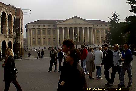 In front of the Arena sits the 'Piazza Bra'. On this huge square there are many bars, restaurants and souvenir shops (at our back) and some interesting buildings. In front of us we have the 'Palazzo Barbieri', the Town Hall finished in 1883. Other interesting buildings are the 'Gran Guardia' Palace, a 1610 Sanmicheli inspired building, and the 'Palazzo Guastaverza', a Sanmicheli work.