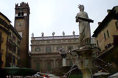 The Madonna Verona Fountain is a work of Cansignorio (1368). The sculpture on the top of it is much older. It was a Roman sculpture that the author of the fountain converted into a Catholic Madonna.