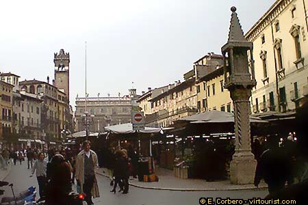 At your left you can see the 'Torre del Gardello', constructed in 1370 by Cansignorio Sella and finished in 1626. And at your right you can see, among others: the Cassa Mazzanati, where there are some interesting Cavalli frescoes from the 16th century; the Domus Nova; and the 15th century tabernacle.