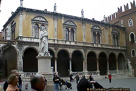 You can see here Dantes Sculpture and, behind, the Loggia del Consiglio building. This Renaissance building (1476-1493) is the most beautiful building of its times in Verona. Its a mixture of Tuscanys elegance and Venetos values.