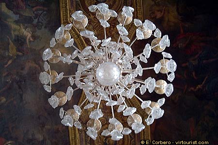 In this photo you can see one of the lamps in detail. The hall is 73 meters long. Large windows on one side of the room, and large mirrors on the other side have a multiplying effect. The room seems to be much wider than it actually is. The walls are decorated with marble, gilded bronze capitals and sculptures.