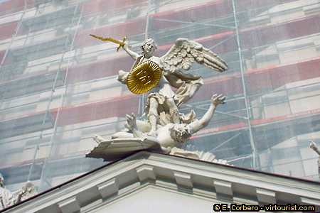 Well get to the Imperial Palace from Michaelerplatz. On this square (platz=square) theres an interesting church: the Michaelerkirche. The church has a Romanesque origin, with Gothic add ons, and a neoclassical facade. Theres also a Baroque portal with the "Descent of Lucifer". If you come here, you can also visit the catacombs, once used as burial area.