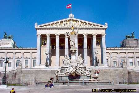 This building is Austrias Parliament. The lower house of Austria --the National Council, whose members are elected by popular vote-- and the upper house --the Federal Council, whose members are chosen by the states-- sit here. The building is on Dr Karl Renners Avenue, Renners was Austrias first Chancellor at the establishment of the republic in 1918, and its president from 1945 to 1950 after the re-establishment of the democratic republic.