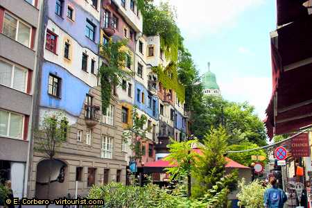 This is the Hundertwasser House (on Löwengasee/Kegelgasse), a project of the Viennese painter Friedensreich Hundertwasser (born Fritz Stowasser in 1928). This 50 apartments buildings was constructed following his original idea, where theres no place for regular forms. Some of its decoration were made by the author himself while the work was in progress. Theres a tourist shop in front of it, and its not strange because its one of Viennas major tourist attractions.