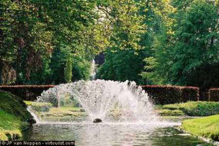 The Annevoie gardens were built on a hillside by a wealthy noblemean in the 18th century. A reservoir at the top of the hillside gathers water from a river and a source, and thus feeds water into the garden's 50 or so fountains, all of which operate simply by gravity flow, without recourse to pumping mechanisms. The paths and plantations follow the geometrical patterns of "French" gardens but make skilful use of the natural scenery.