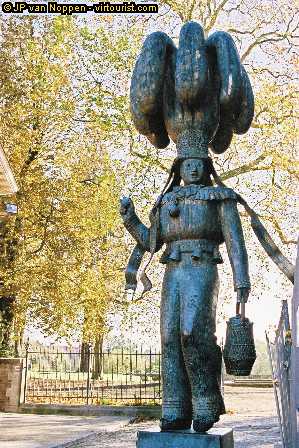 A Gilles costume is made up of a linen suit embroidered with heraldic lions and festooned with ribbons in the Belgian colors, red, yellow and black, and brilliant white lace collars and cuffs. They have straw-filled humps on the back and torso, carry a belt studded with bells, and are shod in wooden shoes, with which they perform a rythmic dance on the cobbled streets. Their headdress, the most remarkable feature of their costume, is a white cylinder surmounted by oistrich feathers. They are equipped with bundles of twigs ("ramons") and baskets of oranges which are thrown at the public. The Gilles belong to different companies, each of which gathers its members in an elaborate ritual, and all of which gather in the town hall square for a night of dancing by the light of fireworks.