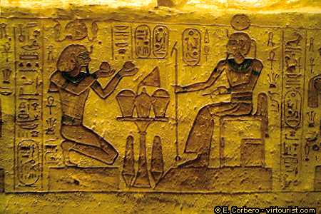 In this scene you can see the King making offerings to Amun. Amun, who used to be a small Theban god, eclipsed other more popular gods in the middle Empire; like the god of war (Montu) and the fertility god (Min). In the new Empire, Amun became the king of all gods and the father of the pharaoh.