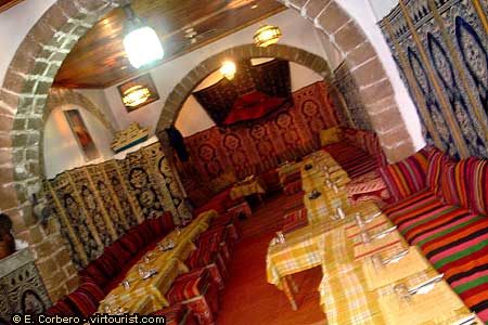 In this picture you can see a local restaurant. The typical Moroccan dish is the Tajine. The Tajine is a clay pot used to cook different dishes. Some of the Tajines you will find everywhere are the vegetables Tajine, the Kebab Tajine and the Kofta (meat Balls) Tajine.
