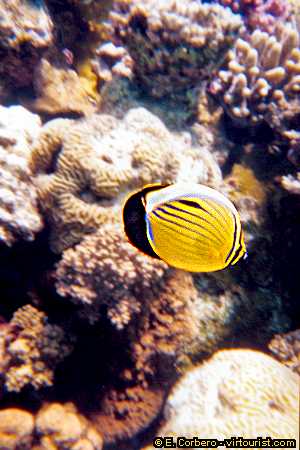 In this photo you can see a Red Sea Melon or Exquisite Butterflyfish (chaetodon austriacus). This is an endemic species of the Red Sea and the Gulf of Aden. Although its bright colors would make of this fish a perfect choice for an aquarium, you will never see one of this in an artificial medium. This species never lives in captivity, unlike so many of the other fishes hailing from this area.