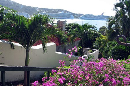 Our next port of call is Charlotte Amalie, capital of Saint Thomas. The Danes built these steps in the mid 1700s. Good exercise for you as you climb up and up and up. Don't forget to count the number of steps. Are there really 99? Once at the top you'll get a stunning view of the harbor where cruise ships are spouting forth their passengers.
