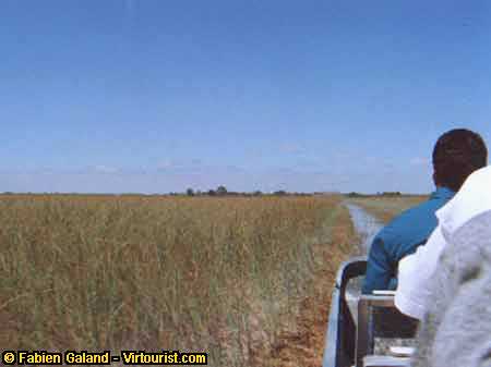 The route ahead is deeper than the flat grass on the left. The grass stretches to the horizon. The name "glade" means a flat place between trees in the forest. Well, here in the flat land of South Florida, there is almost no forest, just grass ; it goes "forever." The "River of Grass" is another name for the Everglades, since the water flows from the north to the south in a "river" that is about 80 km wide. Large pipes under the two major roads (Interstate 75 and State Road 41) that cross the everglades allow the water to cross under the roads. There are other pipes for animals (and cameras in the pipes take video pictures of panthers, foxes, deer and other wildlife).